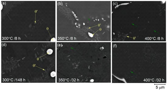 As it was shown by SEM study (Figure 4a,d), low temperature annealing at 300 °C for 8 h and for 148 h led to precipitation of the platelet-like metastable θ′-phase with a typical morphology on the periphery of dendrite cells, that agreed to [45,46,47,48,49,50]. The morphology of the non-equilibrium θ-CuAl2 particles did not change (Figure 4a,d). With increasing annealing time from 8 to 148 h, the number density and size of the θ′-phase precipitates changed insignificantly. Similar θ′-phase precipitates was observed after treatment at 350–400 °C, but a number density of precipitates in this temperature range significantly decreased with increasing aging time (Figure 4b,c,e). Non-equilibrium θ-CuAl2 phase dissolved and its volume fraction decreased to ~0.6 ± 0.2% at 350 °C for 48 h and to ~0.2 ± 0.1% at 400 °C for 32 h. In addition, fine equiaxed precipitates were observed after aging at 350–400 °C (green arrows in Figure 4e,f). TEM studies were involved for precise identification of the precipitates parameters.