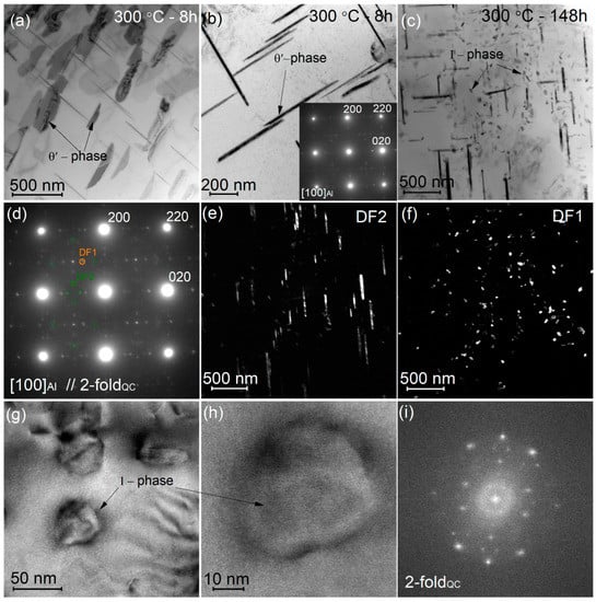After ageing at 300 °C for 8 h, the θ′-phase precipitates (Figure 5a,b) were confirmed. The mean θ′ precipitates length was 290 ± 50 nm and the mean thickness of precipitates was 24 ± 5 nm. Increase ageing time to 148 h (Figure 5c–i) led to a high number density of fine I-phase precipitates but the θ′-phase precipitates parameters remained the same with a mean length of 310 ± 40 nm and a mean thickness of 23 ± 4 nm. According to [15,16] the high stability of the θ′-phase can be the result of Mn atomic segregations to the θ′ interphases. A mean size of the I-phase precipitates was 35 ± 5 nm. It is notable that after similar ageing conditions, the fine I-phase dispersoids are precipitated in Al-Cu-Mn-Be alloy [21,22].