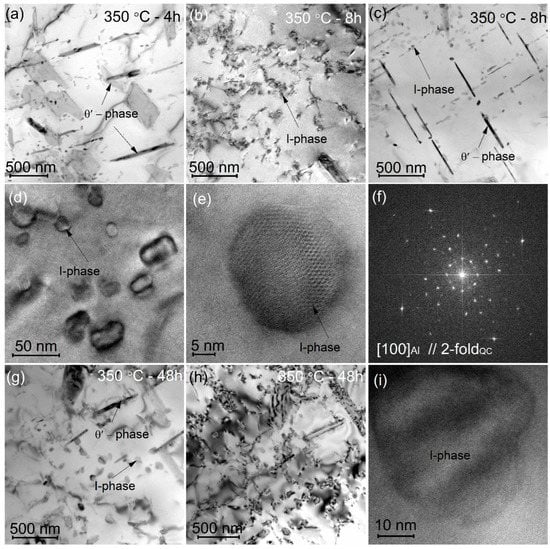 After annealing for 4 h, 8 h, and 48 h at 350 °C (Figure 6), both θ′-phase plates and fine near-equiaxed precipitates were observed. Fine near-equiaxed precipitates exhibited an Ashby-Brown contract (Figure 6b,i) and a Moiré pattern (Figure 6d), which suggested coherency/semi-coherency to (Al) matrix. A Fast Furies Transform (FFT) of the high-resolution images for most of precipitates demonstrated the pattern of two-fold symmetry of the I-phase (Figure 6e,f). Depending on the aging time, a mean size of near-equiaxed precipitates was (33–38) ± 3 nm after annealing at 350 °C. An increase in the heat treatment time to 48 h (peak ageing time) led to a higher number density of precipitates (Figure 6g,i), but insignificancy changed their mean size and structure. Some particles belonged to the crystalline phases but the precipitates were also semi-coherent to the aluminum matrix.