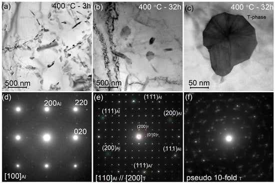 Heat treatment at 400 °C for 3 h led to a high number density of precipitates with a size in a range of 41 nm to 120 nm, respectively (Figure 7). The diffraction pattern after 3 h of annealing revealed reflexes belonged to the θ′-phase and some extra-reflexes suggested precipitation of an additional crystalline phase (see SAED in Figure 7d). The θ′ phase was not found, and predominantly rod-shaped precipitates of the T-phase were observed after peak aging for 32 h (SAEDs in Figure 7e,f). The length of the T-phase precipitates was varied in a range of 118 to 236 nm. Some precipitates exhibited hexagon shape and demonstrated ten-fold symmetry SAED (Figure 7c,f). According to [51,52], the T-phase is an approximant of the decagonal quasicrystal. This microstructure may be the result of multiple-twinning of the T-phases during its growth [53,54,55,56].