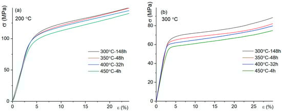 (a,b) Engineering stress–engineering strain compression curves at temperatures of (a) 200 °C and (b) 300 °C for the Al-2%Cu-2%Mn alloy heat-treated with different ageing regimes and final stabilizing aging at 300 °C to 1 h.