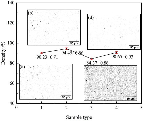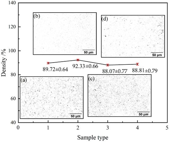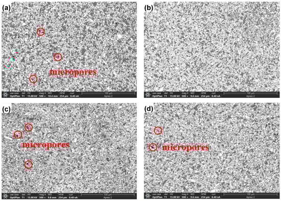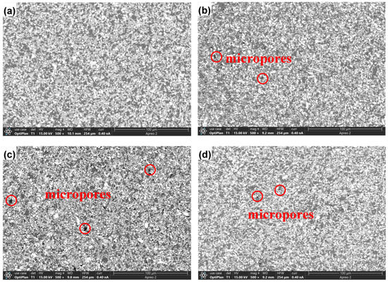 Figure 4 shows the microstructure of WC-Co-TiC cemented carbide with different WC content at Co/TiC = 1:1. As shown in Figure 4a, when the WC content is 50%, the micropores of WC-Co-TiC microstructure are not easily observed. In Figure 4b,d, when the WC content is 60% and 80%, compared with other WC content, the number of micropores in the microstructure of WC-Co-TiC is similar or greater. Finally, when the WC content is 70%, compared with other WC content, the micropores of WC-Co-TiC microstructure are obvious and greatest.