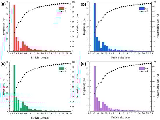 Particle size distribution image of WC-Co-TiC cemented carbides of A series: (a) 50% WC; (b) 60% WC; (c) 70% WC; (d) 80% WC.
