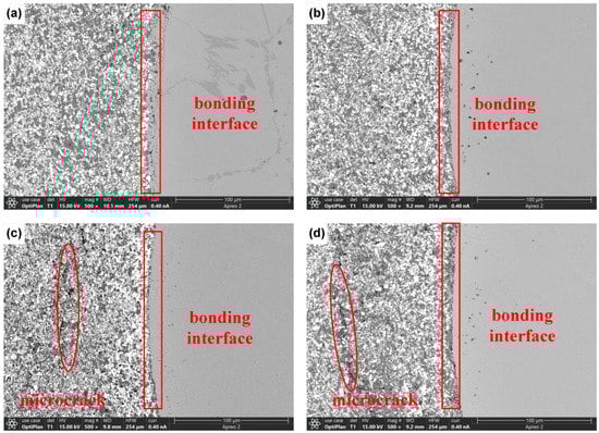 SEM image of composite interface of WC-Co-TiC/304 stainless steel composite of A series: (a) 50% WC; (b) 60% WC; (c) 70% WC; (d) 80% WC.