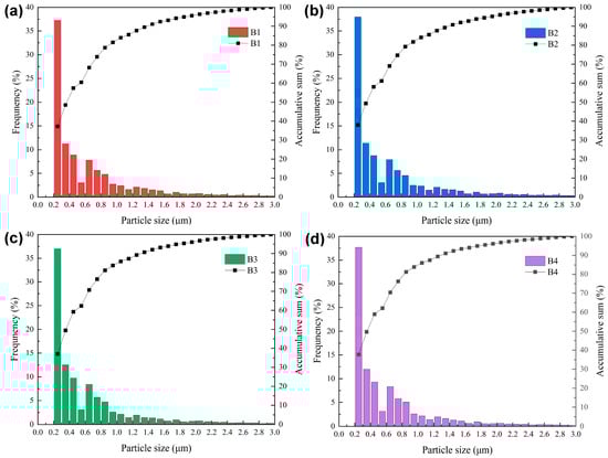 Particle size distribution image of WC-Co-TiC cemented carbides of B series: (a) 50% WC; (b) 60% WC; (c) 70% WC; (d) 80% WC.