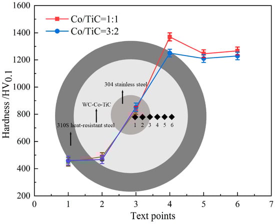 In order to compare the influence of WC content of 60% (1:1) and 60% (3:2) on the microhardness of WC-Co-TiC/304 stainless steel composite, the Vickers hardness of the composite was tested. Figure 12 shows the distribution image of the measured points. Six points are taken from the center of the steel core along the radial direction for measurement. The average value is taken for three measurements of the position of each point. The Vickers hardness distributions of 60% (1:1) and 60% (3:2) are shown in Figure 12.