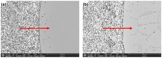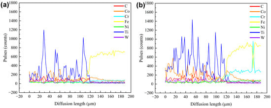 Figure 14a,b shows the linear scanning image of the composite interface of WC-Co-TiC/304 stainless steel composite under A2 [60% (1:1)] and B2 [60% (3:2)], the arrow direction is the test direction, respectively, and the corresponding element distribution in Figure 15a,b. It can be seen from Figure 15 that the composite interface shows that the peak of C element at the composite site decreases significantly, indicating that there is a large amount of C element at the composite site with less diffusion, and most of the C elements exist in the WC-Co-TiC cemented carbide area. The Co element exists in the area of WC-Co-TiC cemented carbide, and a small amount exists in the area of 304 stainless steel, with less diffusion. The Cr and Fe elements diffuse from the 304 stainless steel area to the WC-Co-TiC cemented carbide area. With the increase of diffusion distance, the content of Cr and Fe elements decreases. A small amount of Ni exists in the area of WC-Co-TiC cemented carbide and 304 stainless steel, and there is no obvious diffusion phenomenon. The Ti element peak at the composite site drops obviously, indicating that a large number of Ti elements at the composite site diffuse less. Most of the Ti elements exist in the WC-Co-TiC cemented carbide area, and the diffusion of Ti elements to the 304 stainless steel area is not obvious, which may be caused by the high atomic mass of Ti. The W content in the 304 stainless steel area did not increase significantly, and the diffusion of W element was not obvious.