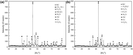 Figure 16a,b shows phase analysis results at the interface of WC-Co-TiC/304 stainless steel composite. The original phase composition of WC, Co, TiC, and (Fe, Ni) at the composite interface was obtained by X-ray diffraction analysis of WC-Co-TiC/304 stainless steel composite through Highscore software, and new phases such as Cr2Ti3, NiCoCr, Ni3Ti,Co3Ti, Fe3W3C, and C2Cr3 were also produced. The elements Cr and Ni in 304 stainless steel diffuse to Co in cemented carbide, and the bonding interface between them is difficult to distinguish, which proves the possibility of their combination. In addition to the composite’s own organizational structure, a new phase has emerged that affects the overall performance.
