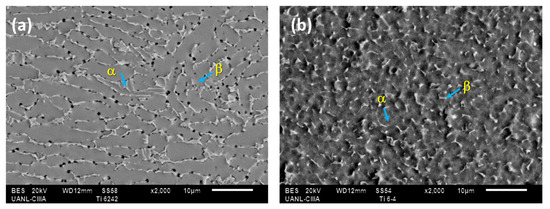 Micrograph obtained by SEM-BES: (a) Ti-6Al-2Sn-4Zr-2Mo and (b) Ti-6Al-4V.