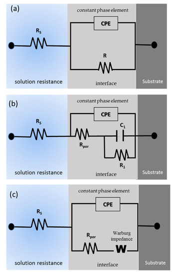 In other research, a diffusion process occurs; this is interpreted as Warburg’s element (W); when the resistance of W is high, it can be associated with the formation of oxide films [40]. Kulova et al. [41] related the W with the diffusion of sodium in the solid phase. Other authors related it to the diffusion of Cl−, and when W impedance was decreased by the concentration of ions, the passive layer was damaged [42].