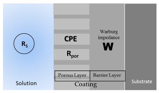 Some authors relate the Warburg impedance at low frequencies with redox molecules that diffuse in the system, giving a high Warburg impedance. However, when the Warburg process occurs at high frequencies, it is associated with low impedance values [81]. In this case, the high values of the Warburg resistance were consequent to a diffusion process that occurred in the compact oxide layer–electrolyte interface, increasing the resistance of the anodized samples. Rajan et al. [82] associated the disappearance in the coating of Warburg impedance with the inhibition of diffusion, so the coating layer is very protective. It is essential to mention that the electrochemical reaction governed by the Warburg impedance is absorption, penetration and diffusion [83]. The absorption–penetration occurs in the porous zone and the interface of the compact barrier and the diffusion in the compact barrier; that process produces an increase in the properties against corrosion.