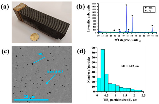 Inconel 625 powders (Hoganas) and NiTi–TiB2 composite powder were used to fabricate samples by direct laser deposition. The sizes of ceramic inclusions ranged between 40 and 180 µm while the average size was 90 µm. The NiTi-TiB2 powder was obtained by self-propagating high-temperature synthesis from a NiB–Ti powder mixture [17]. The average particle size of titanium diboride in the intermetallic matrix was 0.5 μm, and the largest contribution to the distribution was made by particles with the size ranging from 0.1 to 0.2 μm. The Inconel 625 and NiTi–TiB2 powders were mixed at the following ratio: 95 wt. % Inconel 625 + 5 wt. % NiTi–TiB2. The mixture was stirred in a ball mill for 30 min. Massive samples were obtained by direct laser deposition of the powder mixture on a substrate made of 7 mm thick RCE36 steel. An industrial robot M20iB/25 (Fanuc, Oshino-mura, Japan), LS-3 ytterbium fiber laser (IPG Photonics, Oxford, MA, USA) was used for deposition. Laser radiation was focused using an FLW D30 process (IPG Photonics, Oxford, MA, USA). A SO12 coaxial deposition nozzle (ILWT, Saint-Petersburg, Russia) was used to form the gas-powder jet and a 5.0 APS Powder insert powder feeder (Oerlikon, Freienbach, Switzerland). The process of depositing samples from 95% (Inconel 625) + 5% (NiTi–TiB2) by the AM process was carried out in argon atmosphere at a radiation power of 1200 W, and the process rate was 25 mm/s with a beam diameter of 2 mm. The workpieces obtained in this way were homogeneous, they did not contain visible discontinuities and large foreign inclusions. An image of a fabricated workpiece of a high-temperature 95% Inconel 625 + 5% NiTi–TiB2 composite alloy is shown in Figure 1a. The X-ray pattern of the fabricated composite as well as its structure and a histogram of TiB2 ceramic particle sizes distribution are shown in Figure 1b–d.