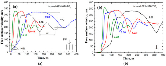 Figure 4 shows the velocity profiles of the free surface of samples of the 95% Inconel 625 + 5% NiTi–TiB2 alloy fabricated in the course of experiments with a light gas gun when loading samples along (a) and across (b) the deposition direction.