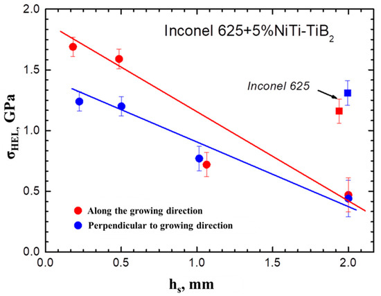 As seen from Figure 5, the Hugoniot elastic limit of the composite alloy decreases noticeably as the elastic wave propagates through the sample. For thin samples, there is a significant difference in its value, which is up to 25%, depending on the loading conditions, while for thicker samples it is practically absent. It means that in the experiments with thin samples, the composite alloy demonstrates noticeable anisotropy of the Hugoniot elastic limit. Overall attenuation of the elastic precursor wave and, accordingly, a decrease in the Hugoniot elastic limit of this alloy in this range of sample thicknesses reaches 75% in experiments with samples loaded along the deposition direction and up to 65% when the samples were loaded across it. It should be noted that under the same loading conditions (sample thickness), the value of the Hugoniot elastic limit measured for pure Inconel 625 alloy [27] exceeds this value measured for the 95% Inconel 625 + 5% NiTi–TiB2 composite alloy by about 2.5 times.