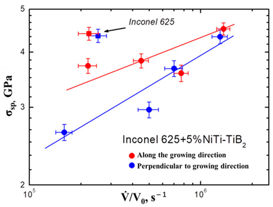 Dependency of the spall strength of the 95% Inconel 625 + 5% NiTi–TiB2 AM alloy on the strain rate before spalling. The data for pure Inconel 625 alloy were taken from [27].