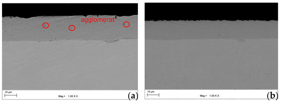 The FESEM figures of the cross-section of the composite coatings deposited with mechanical stirring (sample-II) and ultrasonic agitation (sample-IV) are shown in Figure 5. The black spot in the left graph represents the agglomeration of zirconia. Figure 5a shows that there exists obvious zirconia aggregation in the MSED-deposited Ni-Co/ZrO2 composite coating. A lack of visible agglomeration of zirconia is observed in the UAED-deposited Ni-Co/ZrO2 composite coating with the help of ultrasonic agitation, as shown in Figure 5b. Therefore, the application of ultrasound would effectively depress the agglomeration of nanoparticles and is more suitable to distribute zirconia in the metal substrate during the electrodeposition process. Thickness is one of the important parameters used to evaluate the structure and properties of the coating. The thicknesses of MSED-deposited Ni-Co/ZrO2 composite coating and UAED-deposited Ni-Co/ZrO2 composite coating measured by FESEM are 18.73 μm and 14.53 μm, respectively. The combination of process efficiency and coating thickness can better characterize the performance of the coating prepared under certain specific conditions. Therefore, we calculate the process efficiency of the above two coatings, which are 67% and 45%, respectively. Through the comparison of process efficiency, we can obtain results that are consistent with the previous test.