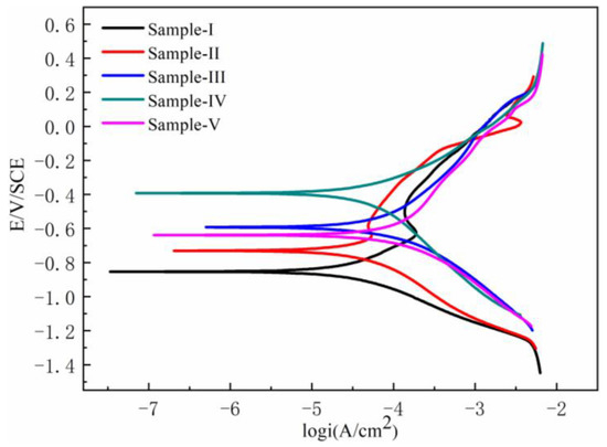 Under various conditions, alloy coated samples have potentiodynamic polarization curves, as shown in Figure 11. Table 4 lists the Tafel slopes, corrosion current (icorr) and corrosion potential (Ecorr) obtained from these curves. The anti-corrosion of the Ni-Co/ZrO2 composite coating is better than that of the Ni-Co alloy coating, and the corrosion potential of the Ni-Co/ZrO2 composite coatings produced with ultrasound shifted to more be positive than that of the coating without ultrasonic stirring. With the increase in ultrasound power from 160 to 240 W, Ecorr shifted positively, whereas icorr decreased noticeably. An explanation for such a shift may be attributed to the modification in grain size and crystal structure of the composite coatings. The combination of nanoparticles can well prevent the spread of corrosion, that is, the continuation of corrosion and the occurrence of deep corrosion. The nanoparticles acted as physical obstructions to the initiation and spread of corrosion, making the Ni-Co/ZrO2 composite coatings more corrosion resistant [31,32].