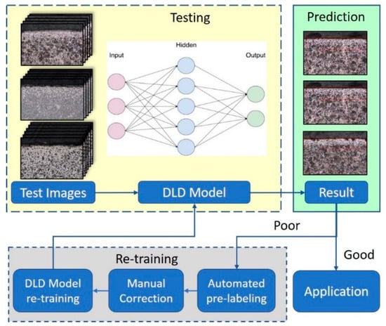 Modern deep learning models have millions of parameters. At the same time, training the DLD network architecture requires many labeled data and much computing time. Transfer learning is a machine learning technique where we can reuse a pre-trained model as the starting point for a model on a new task. In this paper, we propose a retraining strategy to improve efficiency in the DLD model. As a matter of fact, there are not enough decarburization layer samples to train the DLD models. Therefore, after each testing phase, we could use the testing results to make the DLD model more robust, as shown in Figure 2. The poor results mean that the recognition results of the decarburization depth are inaccurate for experienced specialists. In Figure 3, the red boxes show poorer recognition results by applying the DLD method. On the other hand, the yellow boxes present a better result with the manually confirmed correction. For poor results, we revise the error images to implement retraining. To save much manual labeling time, automated pre-labeling employs the re-training models to label the test images automatically. The DLD models achieve better performance for determining decarburization depth through the use of re-training strategies that benefit the final application.