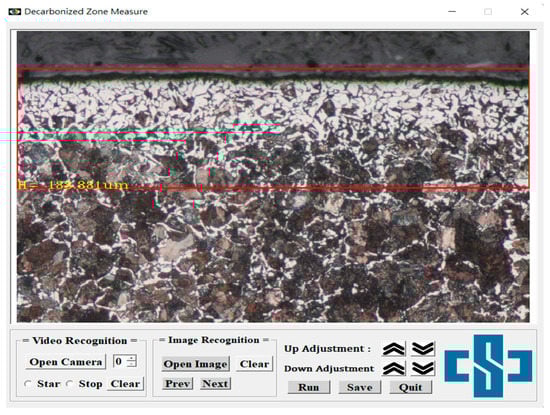 The DLD system has been completed based on the concept of the graphical user interface (GUI), as shown in Figure 6. The GUI system of the DLD model consists of four parts which are called the main window and three control blocks, respectively. Initially, the decarburization layer images are read and displayed on the main window. Next, the user can explore the detection result of the video or image in the main window with the two control blocks of video and image recognition. However, the up and down adjustment buttons were used to correct the image labeling of error detection in the re-training strategy.