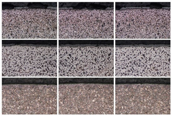 The decarburization images with poor performance. The first rows are images of S55C steel, the second rows are images of 5120H steel, and the third rows are images of 4320H steel.