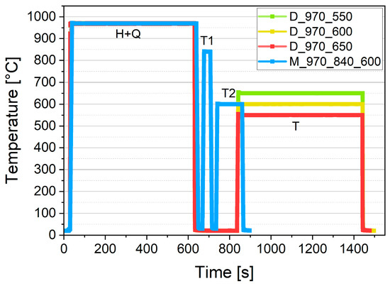 All heat treatments were performed by a modified quenching and forming dilatometer (DIL 805, TA Instruments, New Castle, DE, USA). In all cases, the first stage—a homogenization treatment (H + Q)—was performed at 970 °C for 600 s (cf. Figure 1 and Table 2). For the treatments, the reheating (T) was executed in accordance with application temperatures and process descriptions of present studies [11]: three target temperatures (550 °C (D_970_550); 600 °C (D_970_600); 650 °C (D_970_650)) with a duration of 600 s. The martensite-free sample was produced via high-temperature tempering (T1) at 840 °C for 30 s before being reheated to 600 °C for a duration of 120 s (T2, Table 2). The shorter holding period was chosen since in the previous experiment it was noticed that no significant microstructural change occurs after 2 min. at 600 °C. For each experiment, the heating rate was set to 100 K/s and the cooling rate to a maximum that could be realized with the set-up, which corresponds to ~1000–1600 K/s. Protective atmosphere (He) was used to reduce oxidation of the sample surface.