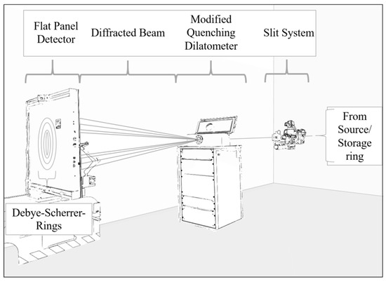 Schematic experimental set-up at the HEMS beamline @ DESY showing the final primary beam slit system, the modified dilatometer and the flat panel detector capturing the Debye–Scherrer rings of the diffracted beam in transmission geometry (for detailed information on the set-up with view into the dilatometer chamber with the sample position in relation to the induction coil, see [25]).