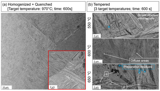 In the homogenized and quenched microstructure (Figure 4a, H + Q), this contrast is very attenuated or even absent. The microstructure thus appears with a rather low grayscale contrast. Instead, the grayscale differences originate from different orientations of the grains (orientation contrast). Morphologically, the microstructure consists of very fine needles, which can be divided into two size categories. The larger needles show length in the low, single-digit micrometer range while the small needles are on a much smaller scale. The parent β-grains and grain boundaries can be easily recognized by clear grayscale deviation over the whole grain (Figure 4a, overview and red-framed insert). In this image, another feature is visible: within a lamella, fine plate-like/stripped structures exist. Based on the investigations of X. Ji et al. [27], these structures are identified as internal twins, which may originate from strain-accommodation processes. Solely based on the contrast of the micrographs, it is not possible to distinguish between parent beta and martensite. A detailed phase characterization by XRD is given in Section 3.2.