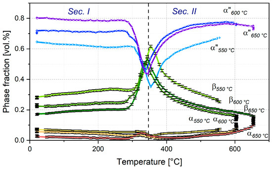 In the direct comparison between the results of the manual (Figure 6) and the sequential refinement (Figure 7), it becomes further apparent that the R.T. phase fractions differ between both routines, e.g., the phase fractions in the 650 °C process vary by ~3 vol.% for α″-martensite, by ~6 vol.% for β-Ti and consequently also by ~3 vol.% for α-Ti. This illustrates the challenges that occur for the three-phase sample state of Ti-6246 due to the superposition of diffraction lines of the present phases due to their crystallographic similarity. A detailed discussion is given in the following chapter (Section 3.2.2).