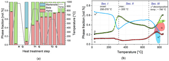 In Figure 8b, the phase evolution during heating is plotted vs. the temperature up to 840 °C and the decomposition path of α″-martensite after its reformation, which was already shown above, is revealed. However, the immediate and reverse conversion of β and α″ into each other appeared only in the low temperature section until approx. 320–370 °C. For further heating, it can be observed that martensite decomposition again starts at temperatures around 670 °C and further accelerates as heating progresses until no more distinct α″-diffraction lines can be detected at 790 °C. Simultaneously, the α-phase fraction starts to rise in this temperature section.