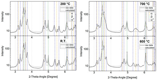 Examples of in situ diffractograms (raw data) vs. calculated diffraction lines with sequential Rietveld refinement at temperatures of 30 (R.T.), 200, 600 and 700 °C. With the logarithmic representation, the local deviations were intentionally exaggerated for illustration purposes. The graphs highlight the superposition of diffractions lines of the α-phase and α″-martensite as well as the β-phase (with the exception of the β-diffraction line at ~5°). They further show the challenges concerning the exact approximation of the peak intensities caused by grain coarsening. The gradual degradation of α″-martensite into α-Ti (see diffractograms at 600 °C and 700 °C) ultimately triggers the misinterpretation of the α″ → α transformation rates.