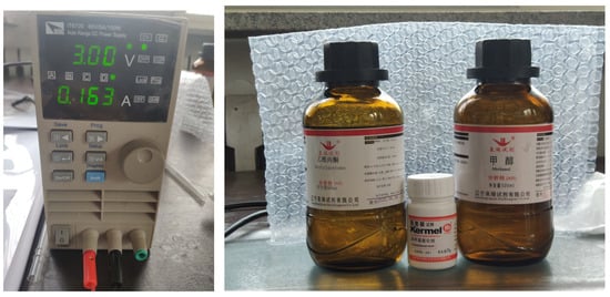 In order to better observe the morphology of inclusions, corrosion of steel matrix by electrolytic etching technology to retain inclusions was conducive to visually seeing the three-dimensional morphology of inclusions. Before electrolytic etching testing the steel, the experimental steel was processed into 5 × 10 × 20 mm. The experimental conditions were as follows: electrolyte (70% methanol, 20% acetyl acetone, and 10% tetramethylammonium chloride), current (0.449 A), electrolytic time (1 h), electrolytic temperature (−1~10 °C), and electrolytic pH (neutral or weakly acidic). Figure 1 shows the electrolytic power supply and electrolytic reagent (methanol, acetyl acetone, and tetramethylammonium chloride)