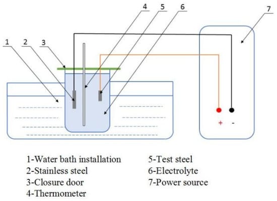 In these conditions, the electrolytic device, as shown in Figure 2, was used for the electrolytic experiment. Electrolytic test equipment included: (1) water bath device, (2) stainless steel, (3) protective cover, (4) thermometer, (5) test steel, (6) electrolyte, and (7) power supply. The cathode was connected with the stainless steel and the anode was connected with the experimental steel. Except for the electrolytic polishing surface, the remaining surface of the test steel was wrapped in paraffin wax to prevent other surfaces from being corroded. The polished electrolytic sample was wiped with alcohol and put it into the electrolytic device. Attention was paid to the electrolytic surface facing the stainless steel sheet. Then, the power supply was adjusted to the appropriate current size, and the time and temperature were well-controlled to conduct the experiment. After electrolytic corrosion of the test steel, it was necessary to clean it with anhydrous ethanol, and the morphology of inclusions in the three samples was observed by scanning electron microscopy.