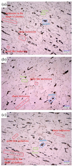 The three groups of steels after forging under metallographic microscope are shown in Figure 3, in which the inclusion is in the red frame, the ferrite is in the green frame, and the pearlite is in the blue frame. Figure 3a shows the microstructure of 1#, which is mainly composed of pearlite, ferrite, and inclusions. The pearlite is relatively large in size and distributed in chain shape, while the inclusions in steel are distributed in chain shape, cluster shape, less spot shape, and in large quantity. Figure 3b shows the microstructure of 2#, which is mainly composed of pearlite, ferrite, and inclusions. The pearlite is small in size, and the amount is the highest of the three groups of steels. The inclusions are dotted and less chained in the steel matrix. Figure 3c shows the microstructure of 3#, which is mainly composed of pearlite, ferrite, and inclusions. The inclusions are distributed in clusters, chains, and a few dots.