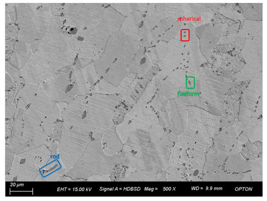 Figure 5 shows the SEM image of 2# under a field of view of 500 times. It is found that the inclusions are spherical, fusiform, and rod-shaped, among which the shapes are spherical and fusiform, accounting for nearly 40% of the total sample amount. Statistical analysis of inclusions in the image shows that the number of inclusions is 59, the maximum size is 18.84 μm, the minimum size is 0.76 μm, the average grain size is 4.43 μm, and the size is less than 1.9 μm.