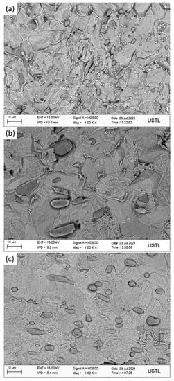 Figure 7 shows the EBSD diagram of the three groups of steel after electrolysis. As shown in Figure 7a, 1# includes type I and type II inclusions. Spherical inclusions with a size of about 2 μm, fusiform inclusions with a size of 3–8 μm, and rod–rod inclusions with a size of 8–14 μm primarily exist in the steel matrix and their distribution is uneven; the length/width of spherical inclusions is close to 1. The length/width of fusiform inclusions is between 1.5 and 2.1, and that of rod–rod inclusions is above 3.7. The size of the largest rod–rod inclusions is 14.6 μm and length/width is 4.98. As can be seen in Figure 7b, 2# includes type I and type III inclusions, mainly composed of irregular flake and inclusions over 10 μm, a small number of 2 μm spherical inclusions and about 4 μm fusiform inclusions, and large flake inclusions with length/width ranges from 2.1 to 2.9; the longest inclusions are 17.7 μm long and length/width is 2.2. Although the size of the flake inclusion is large, its width is also large, so the ratio of aspect to width is relatively low. As shown in Figure 7c, 3# includes type I, type II, and type III inclusions of different shapes, including fusiform, spherical, heart-shaped, droplet, butterfly, and irregular, short rod-shaped inclusions. The length of rod-shaped inclusions with the largest individual size reaches 19.66 μm and length/width is 5.1, while the length of other rod-shaped inclusions is 9–13 μm and length/width is about 3.7.