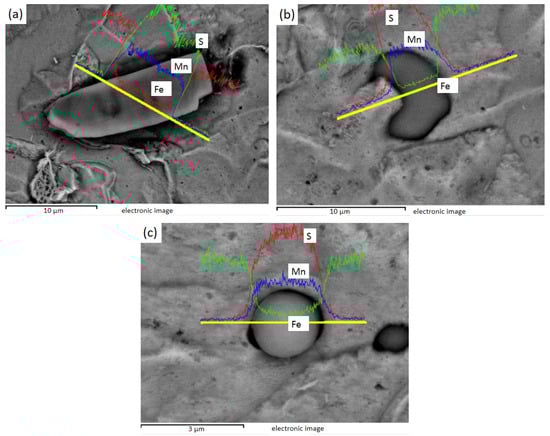 Figure 9 shows the EDS line sweep of 2# after electrolysis, and Figure 9a shows the plat-like inclusion, which can be judged as MnS by energy spectrum analysis. Figure 9b is a crescent-shaped MnS inclusion, and Figure 9c is a spherical MnS inclusion.