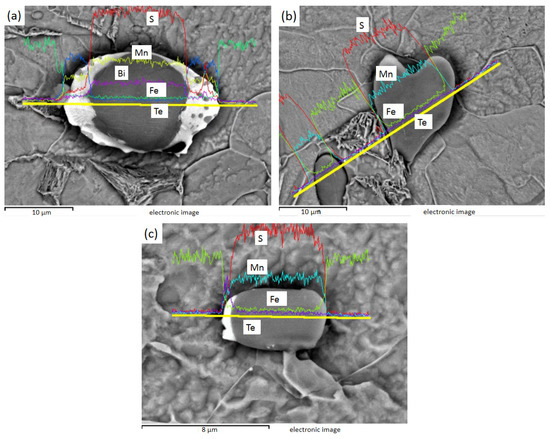 Figure 10 shows the EDS line sweep of 3# after electrolysis. Figure 10a shows the MnS inside the Te package, and Bi is distributed in the MnS. Figure 10b shows the heart-shaped MnS, and Figure 10c shows the MnS with unilateral Te. It can be found that Te exists in steel mainly wrapped in one or both sides of MnS inclusions, while Bi can exist inside MnS.
