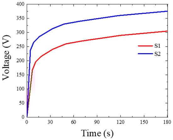 Voltage–time response during MAO treatment of the S1 and S2 samples.
