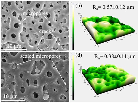 Figure 2 depicts the surface morphologies of the S1 and S2 samples (Figure 2a,b). The PEO-coated samples contained a large number of micropores, which were typical of the samples after PEO coating [,,]. The micropores would originate from the molten oxide and gas bubbles discharged from the discharge channels. The surface of the S1 samples had a few microcracks because of the extreme temperature variations that happened during plasma discharges between the coated oxide layer and the electrolyte. The surface of the PEO coating layer changed after adding Fe(NO3)3 to the electrolyte, becoming smooth and dense with fewer micropores and oxide nodules. The porosity and the size of micropores were determined to be ~ 0.84 ± 0.2 µm and ~11.04% ± 0.3%, and ~0.74 ± 0.1 µm and ~8.56% ± 0.2% for the S1 and S2 samples, respectively. From the AFM results shown in Figure 2c,d, the surface of the S2 sample had a lower value of the mean surface roughness (Ra~0.38 μm) in comparison to that in the S1 sample (Ra~0.57 μm), indicating that the addition of Fe(NO3)3 into the electrolyte during PEO not only reduced the pore size and porosity of the coating but also increased the smoothness.