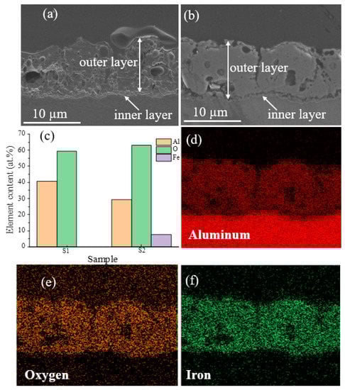Figure 3a,b present cross-sectional SEM images of S1 and S2 samples. The average thickness was calculated using SEM images obtained from at least ten distinct places, and it was found to be the same for both samples (10.45 ± 0.54), indicating that adding Fe(NO3)3 into the electrolyte did not significantly affect the samples’ thickness. The sample coated with Bath A also displayed some oxide nodules and a rough surface with somewhat coarse pores (Figure 3a). As seen by the cross-section image in Figure 3b, the S2 sample exhibited a reasonably homogenous, less porous structure and fewer micropores. According to the EDS results shown in Figure 3c, Al and O were detected in both samples, while Fe was only discovered in the S2 sample. The distributions of Al, O, and Fe elements are shown in Figure 3d–f.