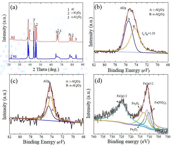 (a) XRD patterns of the S1 and S2 samples. (b) XPS data of the Al2p spectrum for the S1 sample. (c,d) XPS spectra of Al2p and Fe2p for the S2 sample, respectively.