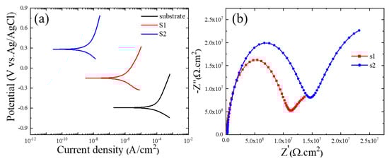 Results of PDP tests of the bare substrate, S1, and S2 samples immersed in a 3.5 wt.% NaCl solution.