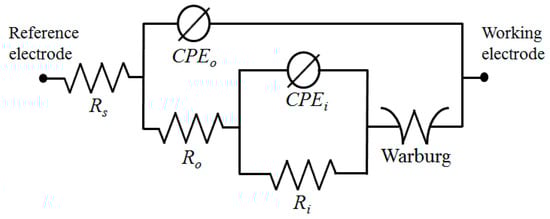 AC impedance tests were performed in a 3.5 wt.% NaCl solution to obtain a better understanding of the impacts of Fe(NO3)3 on the corrosion behavior of the S1 and S2 samples. The results are shown in Figure 5b as Nyquist plots. According to the results of the Nyquist plots, samples containing Fe(NO3)3 had larger semi-circle loop diameters, as seen in Figure 5b, which suggested more excellent resistance to the corrosive environment. This result was in line with the findings of the potentiodynamic polarization curves in Figure 5a. A model of an equivalent circuit, shown in Figure 6, was used to fit the Nyquist curves. According to the circuit model, Rs stands for the solution resistance between the working electrode and the reference electrode, Ro for the outer layer resistance parallel to CPEo, and Ri for the inner layer resistance parallel to CPEi. A generic CPE was used rather than a capacitive element to achieve a perfect match and consider the surface heterogeneity of PEO coatings (Equation (9)) [,,].