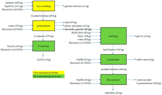 The process was simulated in batch mode using SuperPro Designer 12 (Intelligen, Inc., Koch Plains, NJ, USA). The multi-parametric analysis was performed by simulating the complete process (cryomechanical followed by hydrometallurgical process for Mn and Li recovery), or a part of it (cryomechanical section and Li recovery), and varying the following inputs: