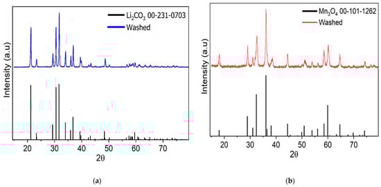 Mn and Li products were also characterized by X-ray diffraction, evidencing relevant peaks of Mn3O4 and Li2CO3 phase, respectively (Figure 2); then, in the case of Mn hydroxides (generally amorphous products), the presence of both Mn(II) and Mn(III) could be assumed due to partial oxidation of Mn during precipitation.