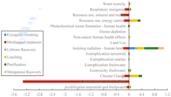 The LIBAT process impact showed negative values (credits towards the environment) in many categories: acidification, cancer human health effect, eutrophication (both marine and terrestrial), land use, ozone depletion, photochemical ozone formation, resource use and respiratory inorganics. This result was mainly due to the recycling of lithium, manganese and steel scraps. The avoided impacts resulting from material recycling overcome the emissions of the process. Furthermore, there was also a positive effect for the environment due to the plastic exploitation for energetic scopes.