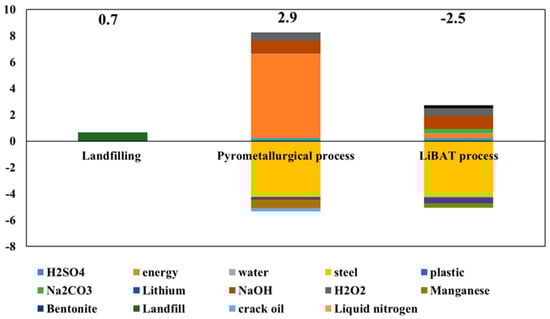 In order to have a comparison for all impact categories, an environmental performance index was evaluated for landfilling, the LIBAT process and the pyro-metallurgical process, normalizing and weighting the different impact categories. This index showed that landfilling had a load of 0.7, the pyro-metallurgical process had 2.9 (mainly due to energy consumption) and LIFE-LIBAT resulted in a credit of −2.5 towards the environment (Figure 4), confirming the benefits of the proposed process and the fact that using a pyro-metallurgical approach has high impact due to high energy consumption which cannot be balanced by the environmental credit of recovered fractions. Furthermore, a sensitivity analysis was performed to estimate the necessary energy decrease needed to make the pyrometallurgical approach sustainable from an environmental point of view. The assessment (considering possible energy savings between 10 and 50%) showed that the balance between impacts and recovery benefit could be reached only by an energy reduction of 50%, which resulted in an index of −0.5. This hypothesis, almost impossible to achieve at a real scale, confirmed the relevant advantage of the LIBAT option.