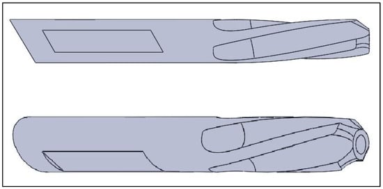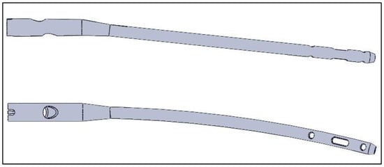 Three-dimensional representations of the femoral intramedullary nail and the screws were generated using SolidWorks 2019 software. The models for the intramedullary nail and helical screw were generated using the measurements from Hamandi et al. []. The information obtained provided important specifications for the recreation of the cephalomedullary (CM) nail, including the length of the nail and screws, curvatures, and orientation of the screws in relation to the femoral nail. Measurements were taken from the intramedullary nail to gather the missing information needed to create the 3D models (Figure 1 and Figure 2).