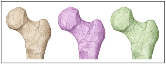 The femur model, created by compiling masks in Mimics software, was then transferred into 3-matric software for mesh generation and special condition editing (as shown in Figure 3). Three femoral bone models were produced, from which the femurs that simulated different types of common hip fractures were made. These fractures included intracapsular, intertrochanteric, and subtrochanteric (as shown in Figure 4). This was achieved by first mapping the fracture paths on the surface mesh and then making a sweeping cut around the femur’s features by removing 1 millimetre of the bone at three different levels. The mesh was then regenerated to produce the three models of fractured bones.