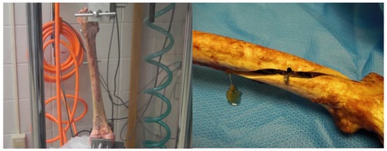The experiments conducted at the biomechanics laboratory located at Miami Valley Hospital in Dayton, Ohio, USA, included 28 pairs of cadaveric femurs with fixation devices (Figure 6) [], which were compared with the current study models. Although, only the models with long titanium nails (7 pairs) were included in the evaluation. To validate the computational simulation, the comparison focused on comparing the impact on the femoral bone and the CM nail, with a particular emphasis on exploring the differences between the simulation and experimental results in terms of bone stiffness, taking into account the material used in the device.